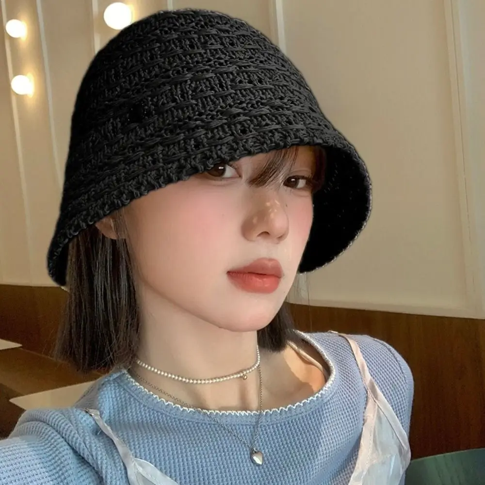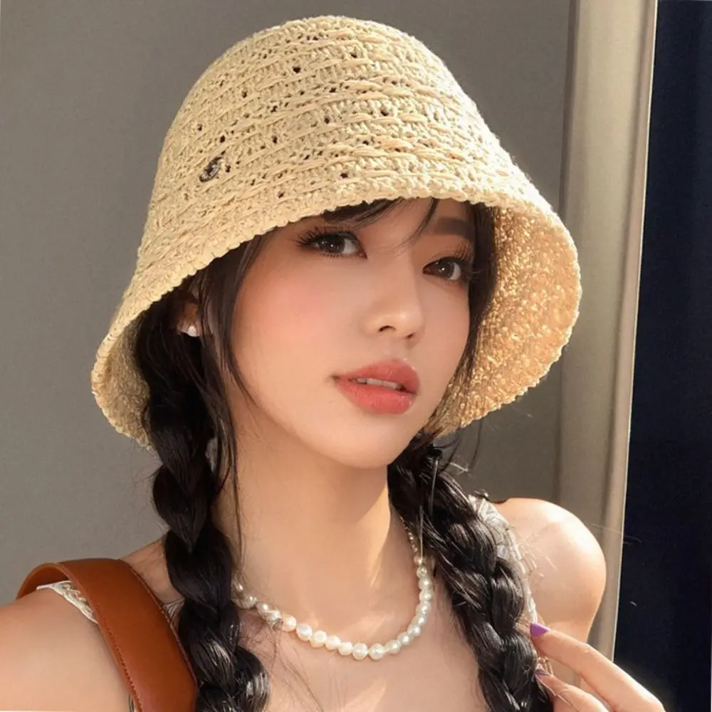 Elegant Summer Straw Sun Hat Wide Brim Breathable Straw Bucket Hat Vacation Hollow Beach Visor Cap Travel