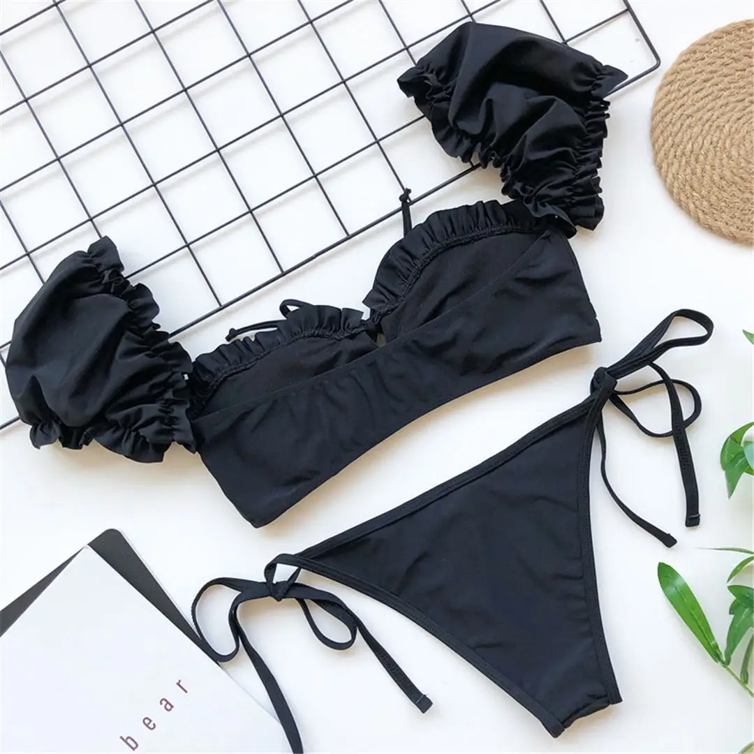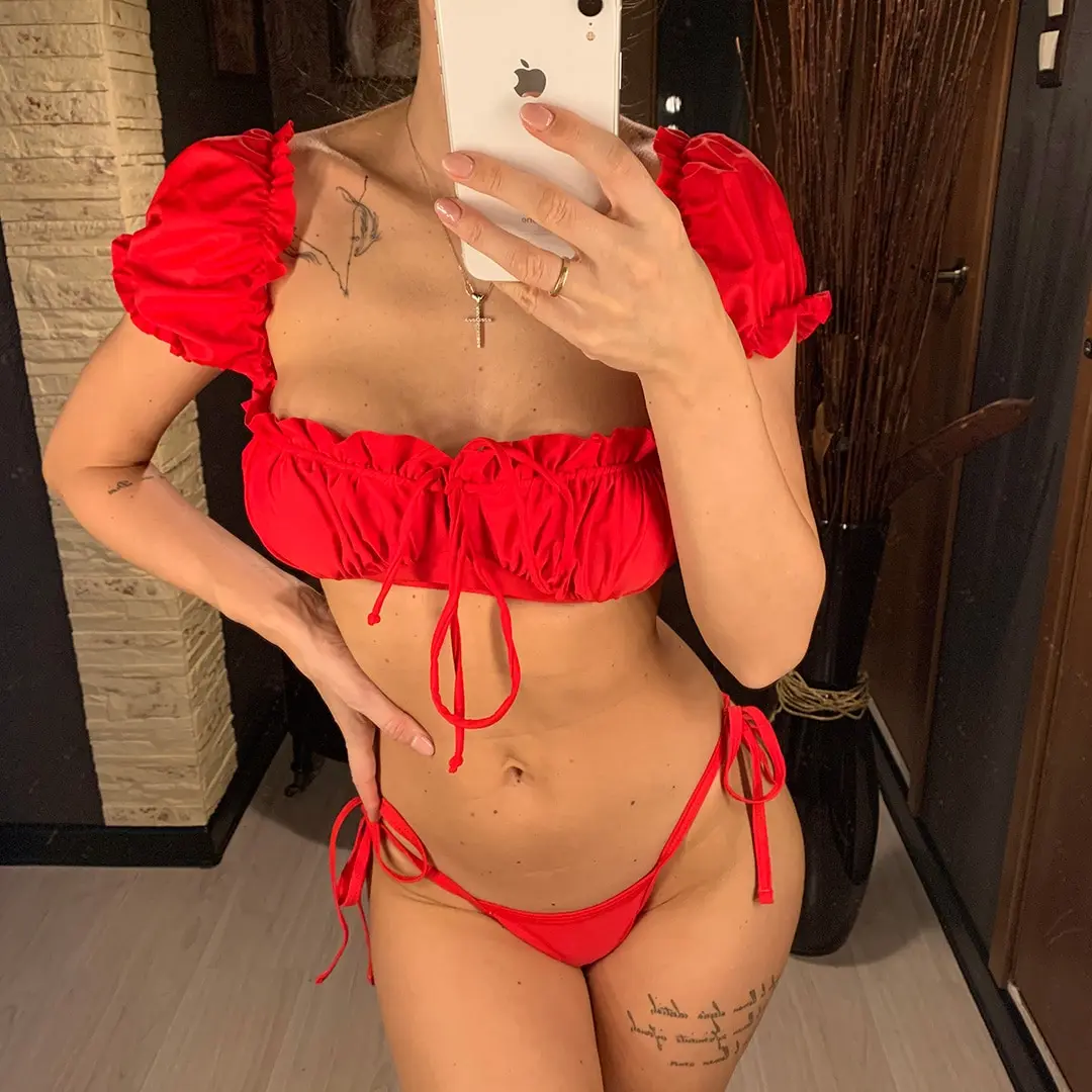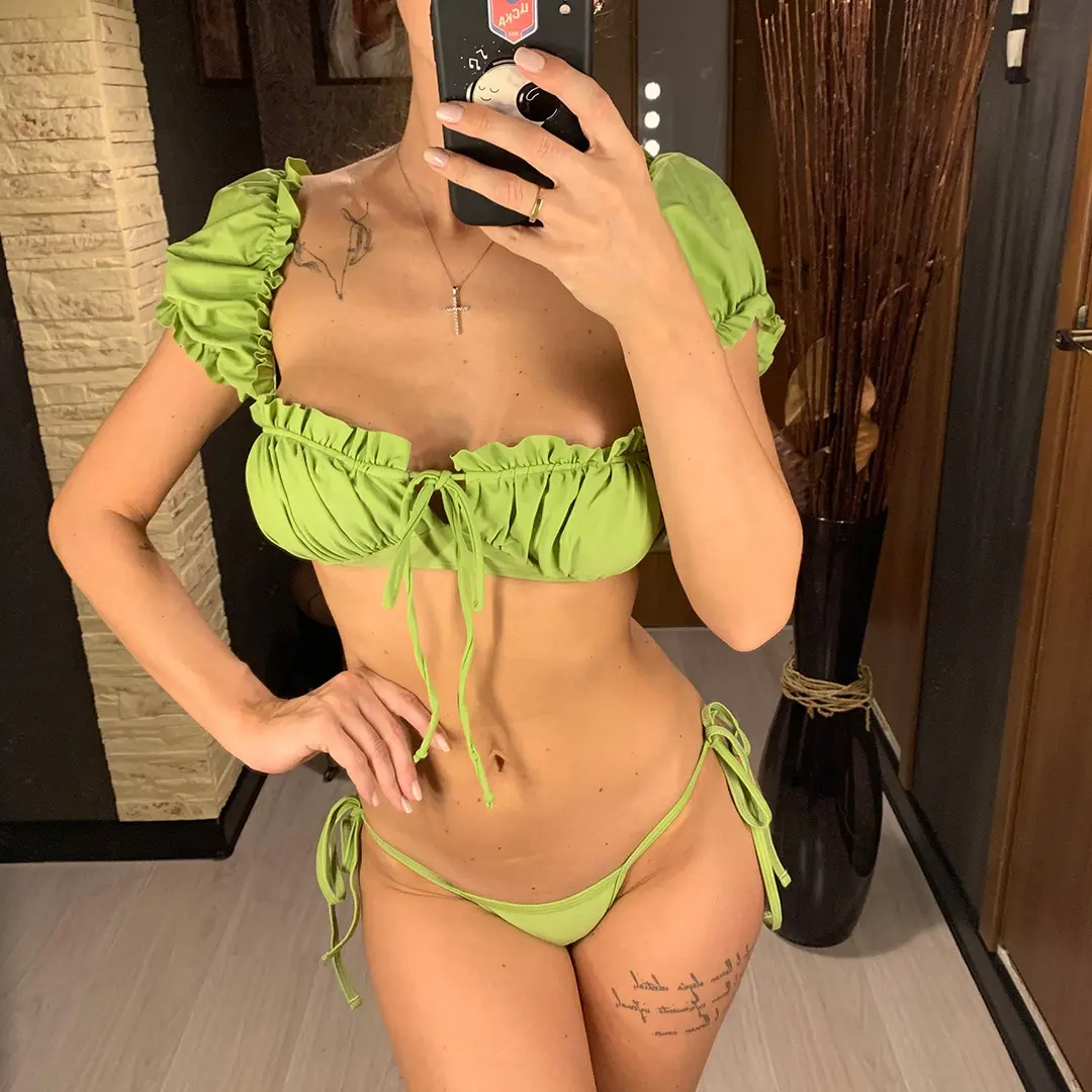 Short Sleeve Brazilian Pleated Ruched Bikini Swimsuit Female Women Swimwear Two-pieces Bikini set Bather Bathing Suit Swim V1729